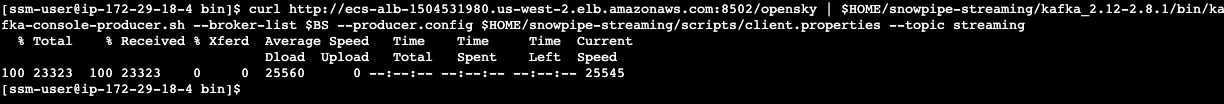 curl --connect-timeout 5 -k https://ecs-alb-1504531980.us-west-2.elb.amazonaws.com:8502/opensky | $HOME/snowpipe-streaming/kafka_2.12-2.8.1/bin/kafka-console-producer.sh --broker-list $BS --producer.config $HOME/snowpipe-streaming/scripts/client.properties --topic streaming