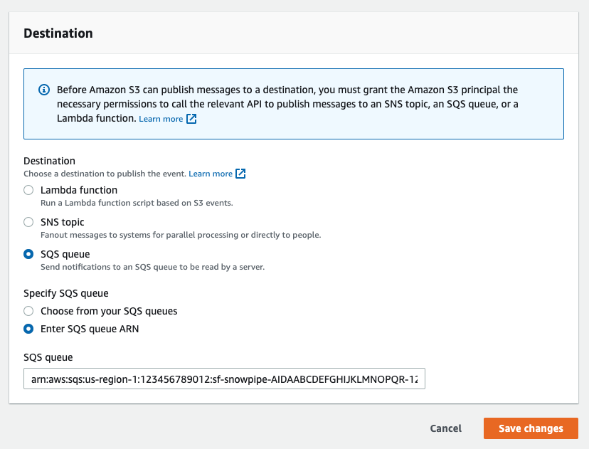 - SQS queue ARN: Paste the SQS queue name from the SHOW PIPES output.