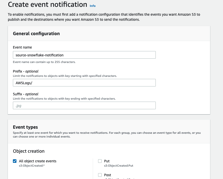 - Name: Name of the event notification (e.g. Auto-ingest Snowflake).