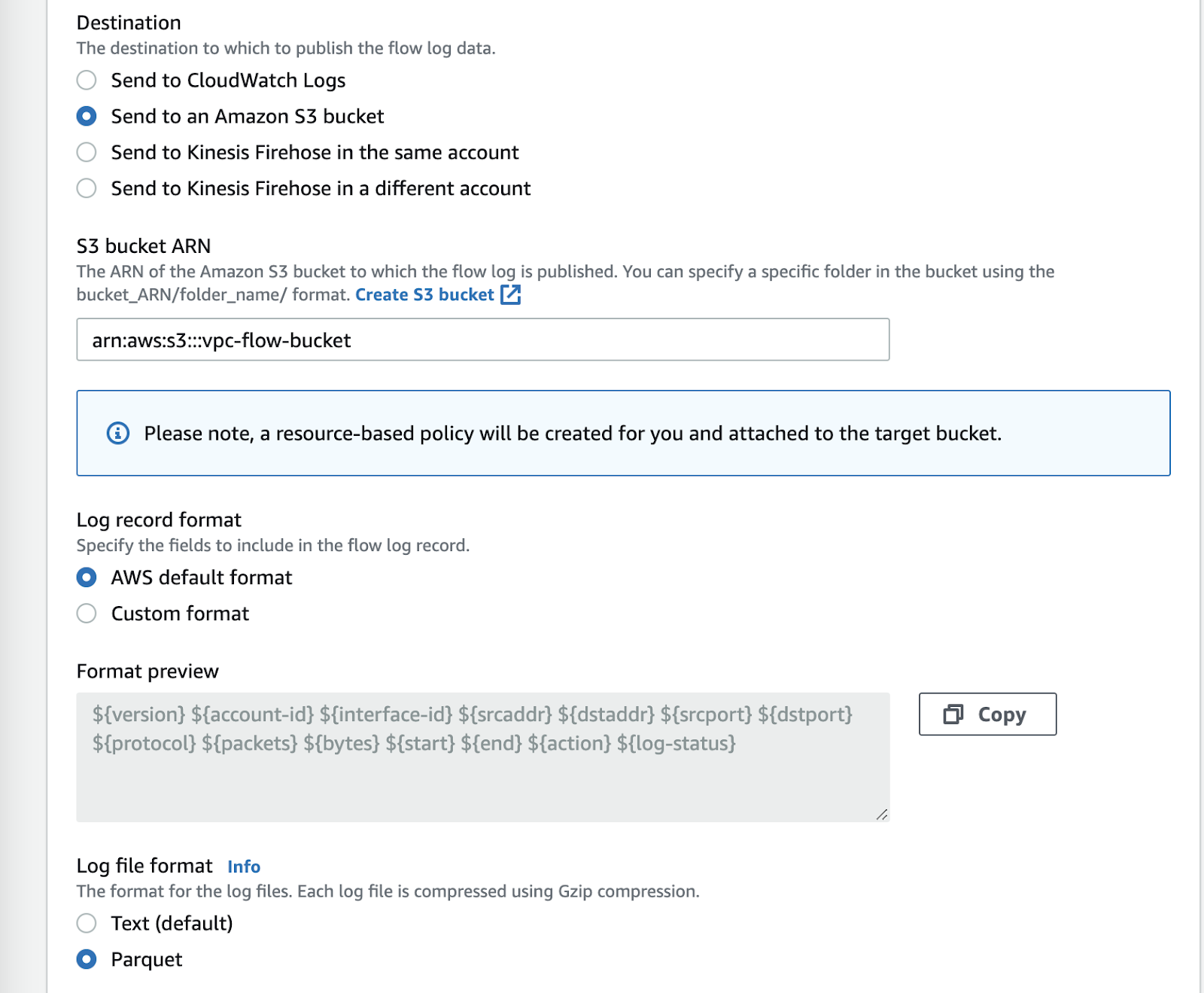 Configure VPC flow logs as desired. Ensure the following settings: