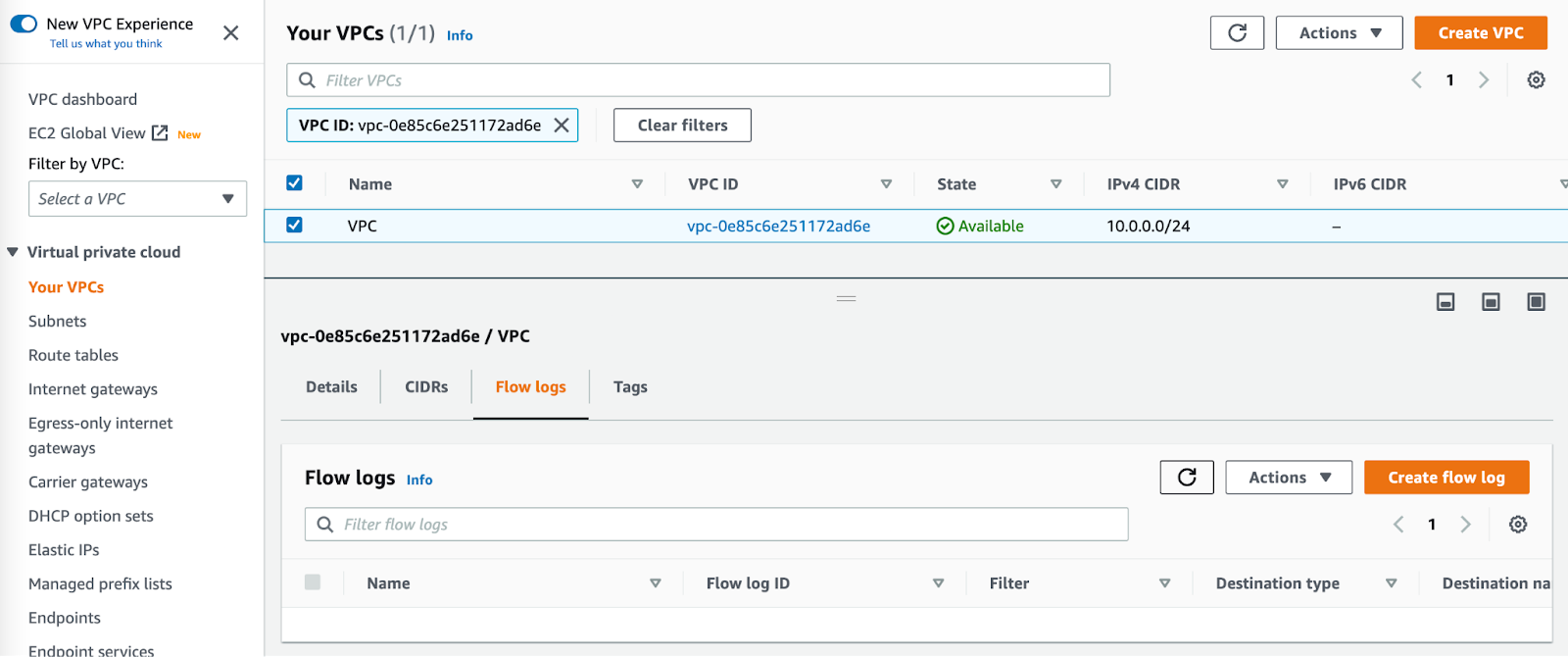 From the VPC page in the AWS console, select the VPC you wish to enable flow logs on. Select the “Flow Logs” tab and press “Create flow log”