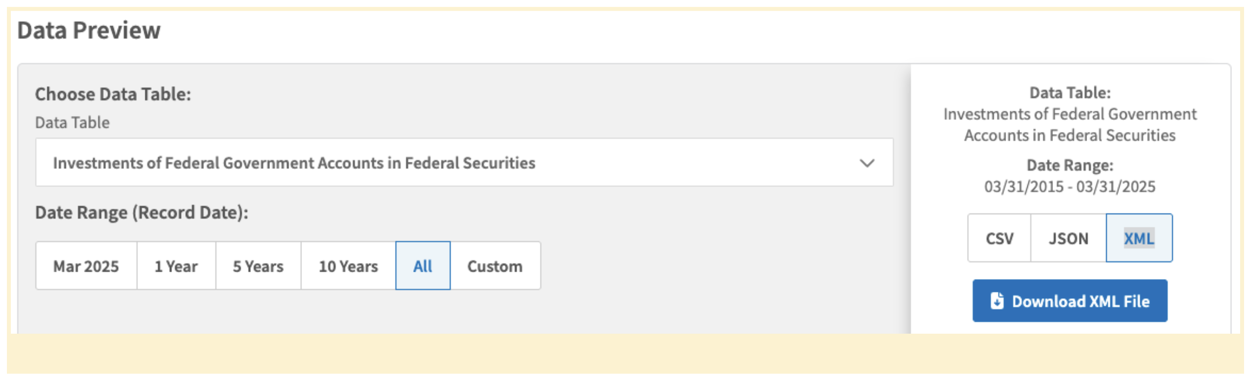 We are using the Investments of Federal Government Accounts in Federal Securities dataset from the US Treasury.