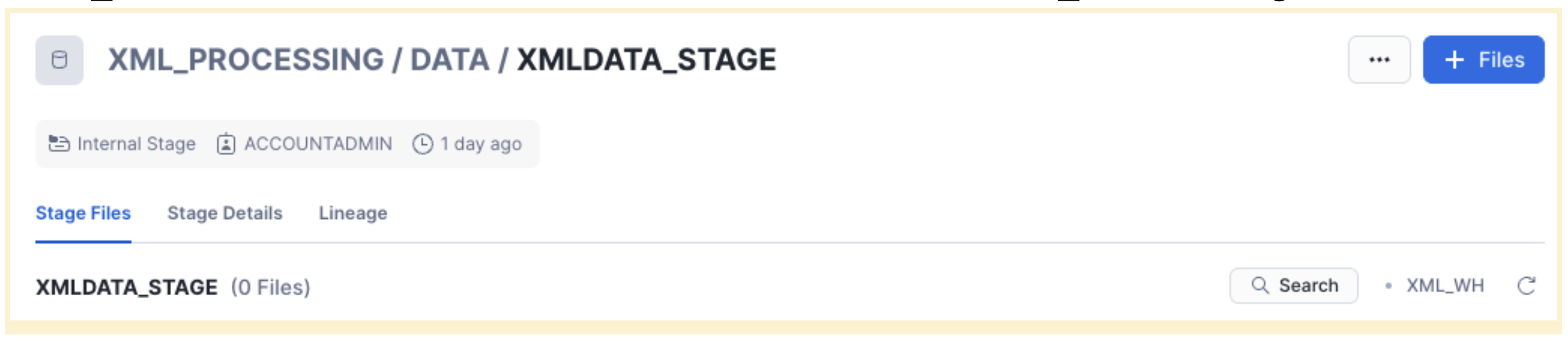 Login to your Snowflake Account and from the left navigation menu select Data / Database "XML_PROCESSING" database, "DATA" schema and "XMLDATA_STAGE" stage