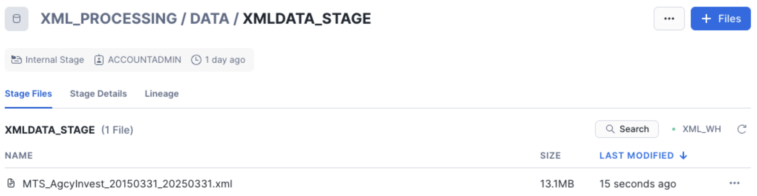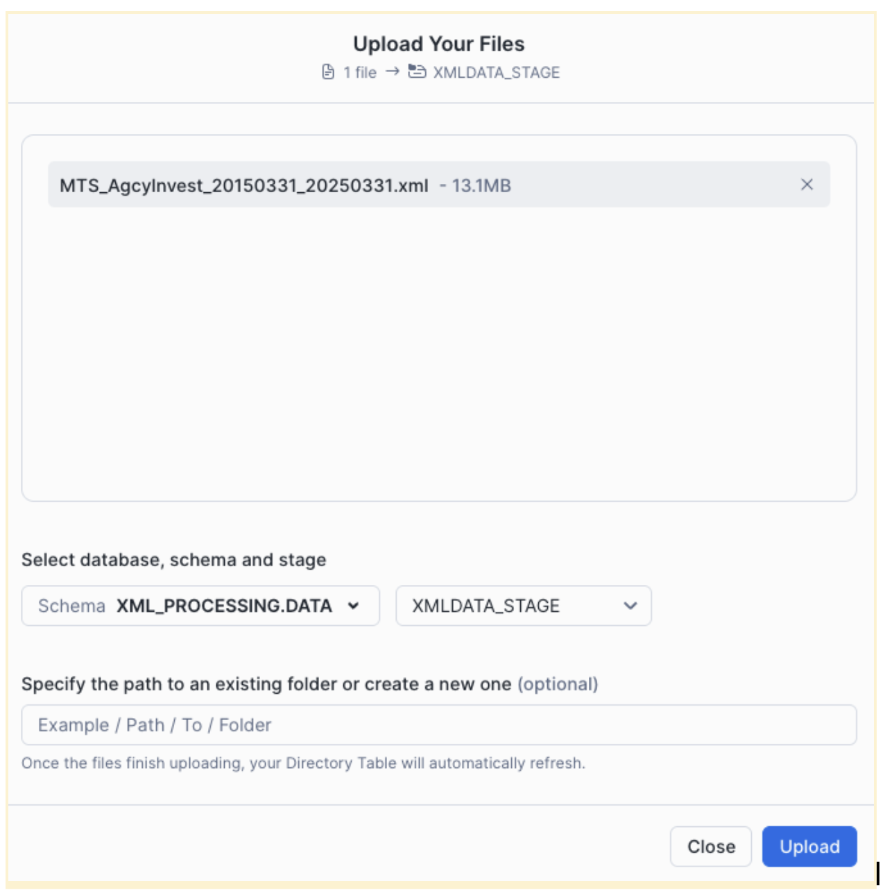 stage_file_path = f'@XML_PROCESSING.DATA.XMLDATA_STAGE/MTS_AgcyInvest_20150331_20250331.xml' df = session.read.option("rowTag", "row").xml(stage_file_path) # df.show() df.write.mode("overwrite").save_as_table("XML_PROCESSING.DATA.MTS_AgcyInvest") # print(df.queries)