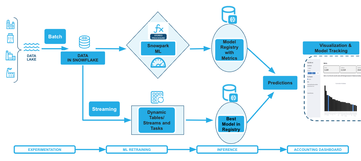 This solution architecture shows you how to manage Machine learning models from experimentation to production using Snowflake MLOps features