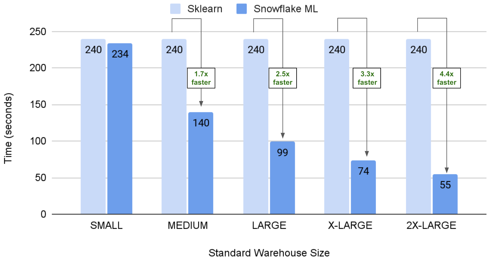 Initially, we integrated directly with scikit-learn’s GridSearchCV and RandomizedSearchCV tuning implementations, and off-loaded the computation to the Snowflake engine. Underneath the hood, we use a single node (stored procedure) to execute the tuning job. We used a stored procedure because the training process requires access to the full data set and can be repurposed for every function. However, while stored procedures are easier to implement, they are inherently single-node, regardless of the chosen warehouse size. This limitation means that even if a warehouse has eight nodes, not all will be used for this API request.