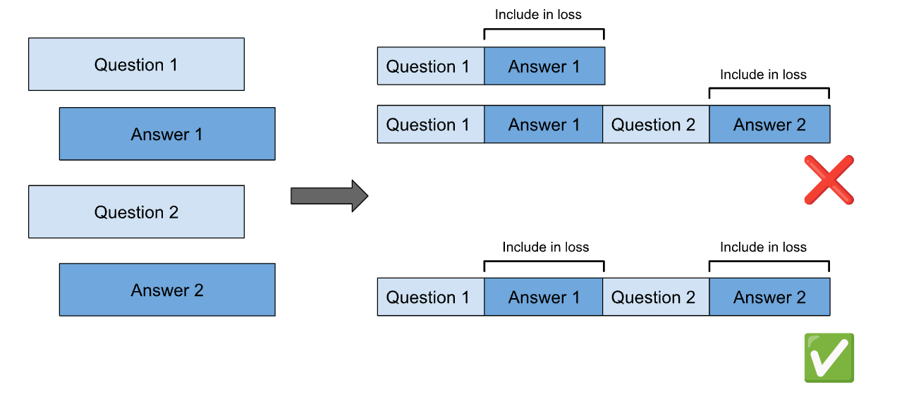 Solution No. 1: Packing multiple examples into a single sequence. A standard practice from pre-training, which we repurposed in instruction-tuning, is sequence packing. Instead of just a single (prompt, completion) pair in each sequence of length 4096, we “packed” multiple examples into each sequence in the form (prompt_1, completion_1, …, prompt_n, completion_n). Sequence packing ensures more examples fit into each batch and thus improves training throughput.