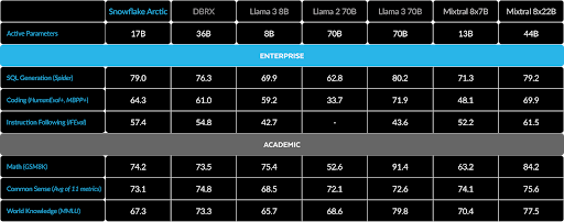 As covered in the launch blog, Arctic-Instruct performs well on most non-generative and academic benchmarks, and excels at enterprise-specific tasks. Arctic-Instruct’s average performance across enterprise benchmarks outperforms DBRX, Mixtral 8x7B, Llama 2 70B, and comes within striking distance of Llama 3 70B and Mixtral 8x22B, which are likely trained on a lot more compute (e.g., Llama 3 70B is pretrained on 16x more compute than Arctic). Our model also performs competitively on the general commonsense reasoning benchmarks.