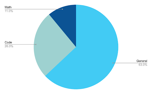 - Code: The coding split consists of programming problems and conceptual questions on programming topics. It is heavily weighted towards the most popular languages on GitHub, with over 50% of the examples in Python and a significant minority in Java, JavaScript, and Go.
