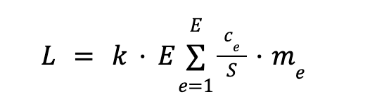 where k is a constant (0.01), E is the number of experts, S is the number of tokens in the batch, c_e is the number of tokens that are routed to expert e, and m_e is the mean gating weight assigned to expert e across all S tokens. This loss function is minimized when the routing function assigns a gating weight of 1/E to every expert for every token. In that case, the mean gating weight is 1/E, and each expert is assigned around S/E tokens, so