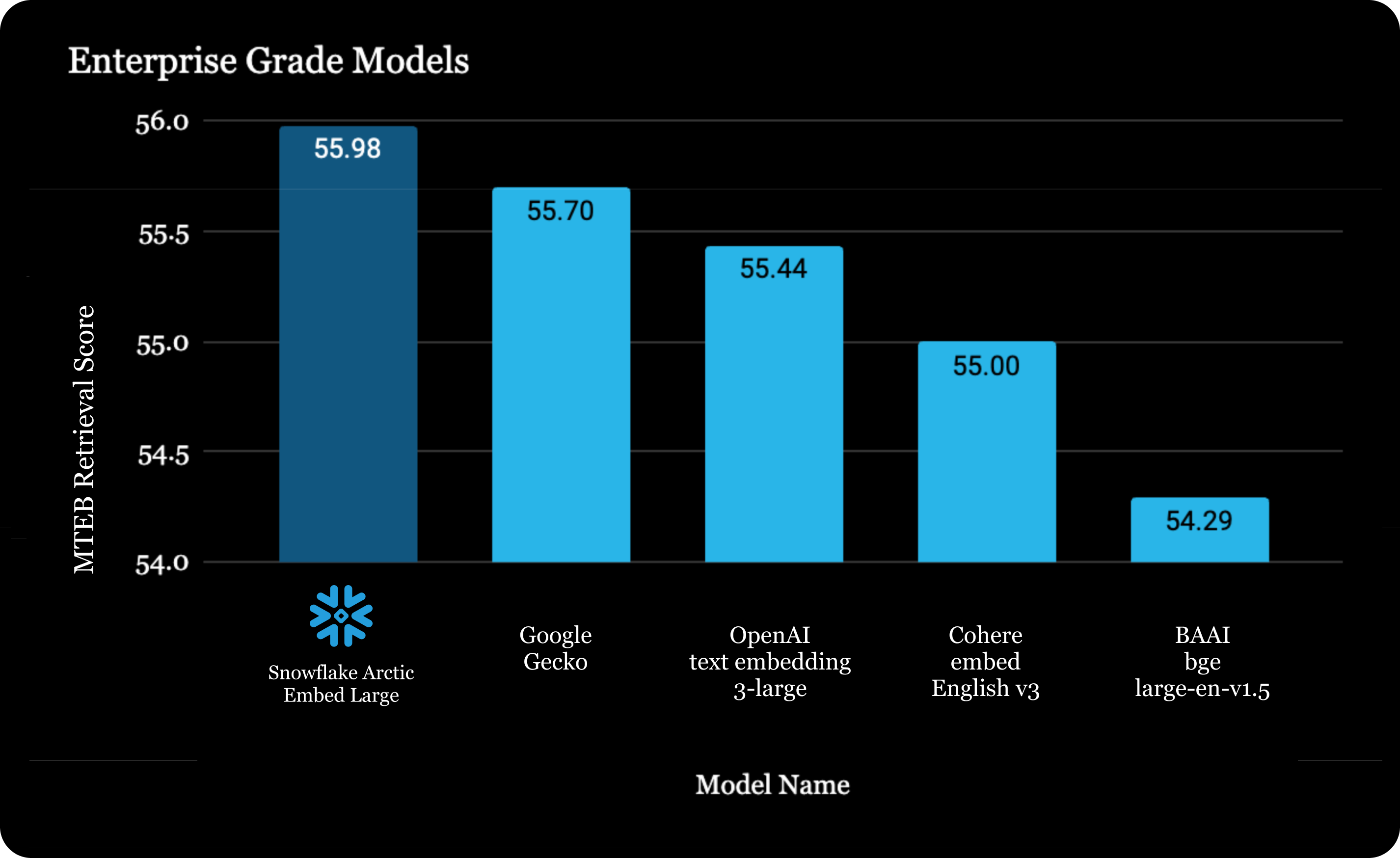 Today Snowflake is launching and open-sourcing with an Apache 2.0 license the Snowflake Arctic embed family of models. Based on the Massive Text Embedding Benchmark (MTEB) Retrieval Leaderboard, the largest Arctic embed model with only 334 million parameters is the only one to surpass average retrieval performance of 55.9, a feat only less practical to deploy models with over 1 billion parameters are able to achieve. The family of five models are available on Hugging Face for immediate use and in Snowflake Cortex embed function (in private preview), available soon. The models, which deliver leading retrieval performance, give organizations a new edge when combining proprietary datasets with LLMs as part of a Retrieval Augmented Generation (RAG) or semantic search service. These impressive embedding models directly implement the technical expertise, proprietary search knowledge, and research and development that Snowflake acquired last May via Neeva.