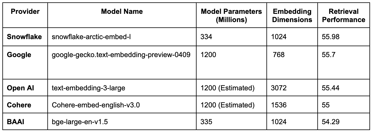 As shown in the table below, snowflake-arctic-embed-l outperforms retrieval performance, having one-quarter of the estimated parameters and one-third of the dimensions compared to Open AI.