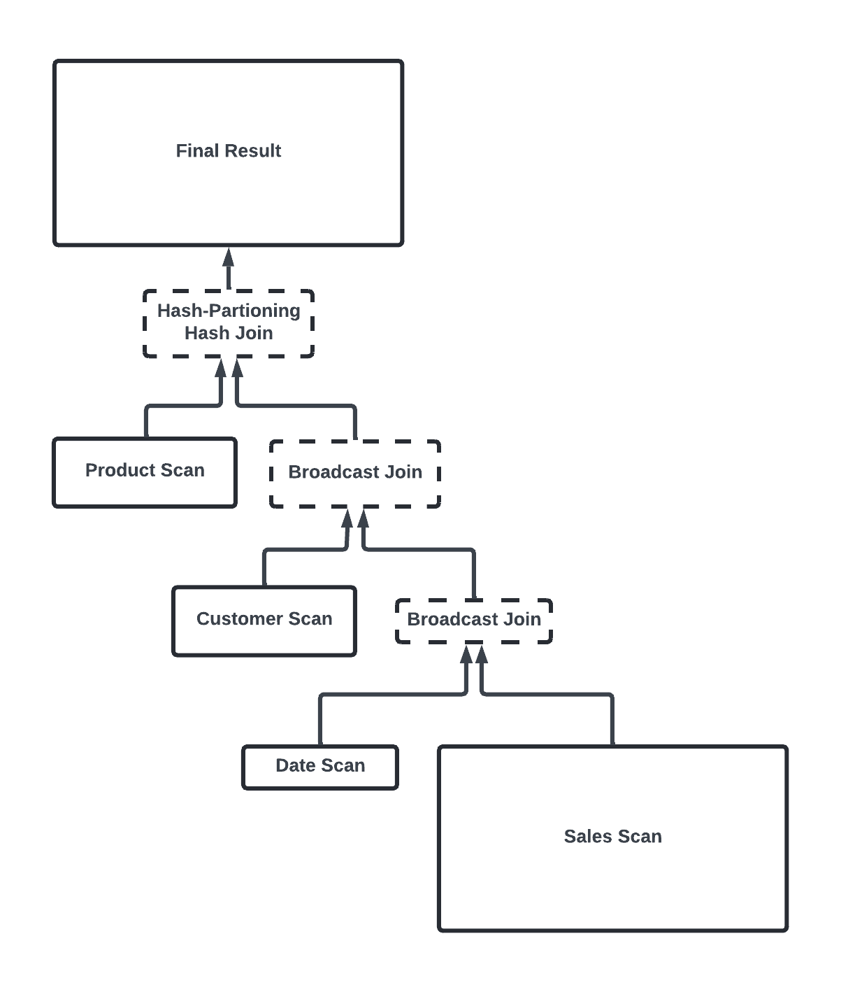 date d ON s.date_id = d.date_id;Efficiently joining these tables and selecting optimal join strategies are crucial for query performance. The performance of individual joins significantly depends on the chosen join distribution strategy — in this case, hash-partitioned hash joins vs. broadcast joins.