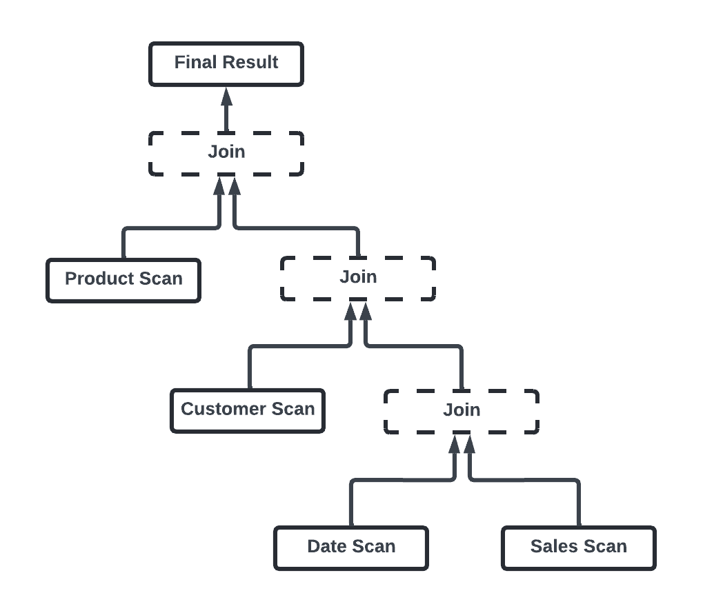Another area where we made significant improvements involves query plans with deeply nested right-deep join trees. In Snowflake connotation, right-deep joins involve dimension tables that form the build sides of a long join pipeline, all relating to a common fact table (the sales table, from our example). This structure is common in BI queries, where large fact tables are joined with multiple dimension tables, and is generally the preferred execution strategy for handling complex queries with multiple joins.