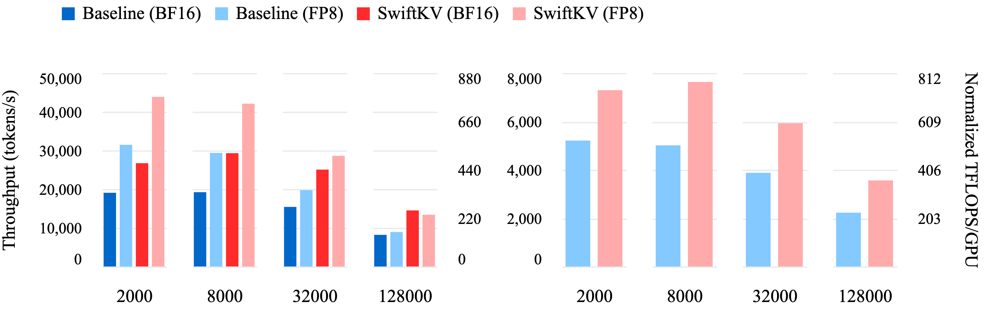 Note that for an input length of 8K tokens, SwiftKV achieves a staggering 30K tokens/sec/GPU (480 TFLOPS/GPU) and 240K tokens/sec aggregate for Llama 3 8B, and 32K toks/sec over 8xH100 GPUs for Llama 3.1 70B model, which corresponds to 560 TFLOPS/GPU of BF16 performance when normalized to baseline. Considering this is over 56% of the normalized hardware peak, it is an unusually high throughput for BF16 inference workloads, which is difficult to achieve even in training scenarios.