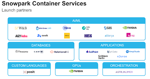 Hay muchas más soluciones de partners integradas en Snowpark Container Services, como bases de datos diseñadas específicamente (RelationalAI, Pinecone, CARTO), ML y operaciones de aprendizaje automático (machine-learning operations, MLOps) (por ejemplo, H2O.ai, Kumo AI, Weights & Biases), y hasta aplicaciones enteras (Amplitude).