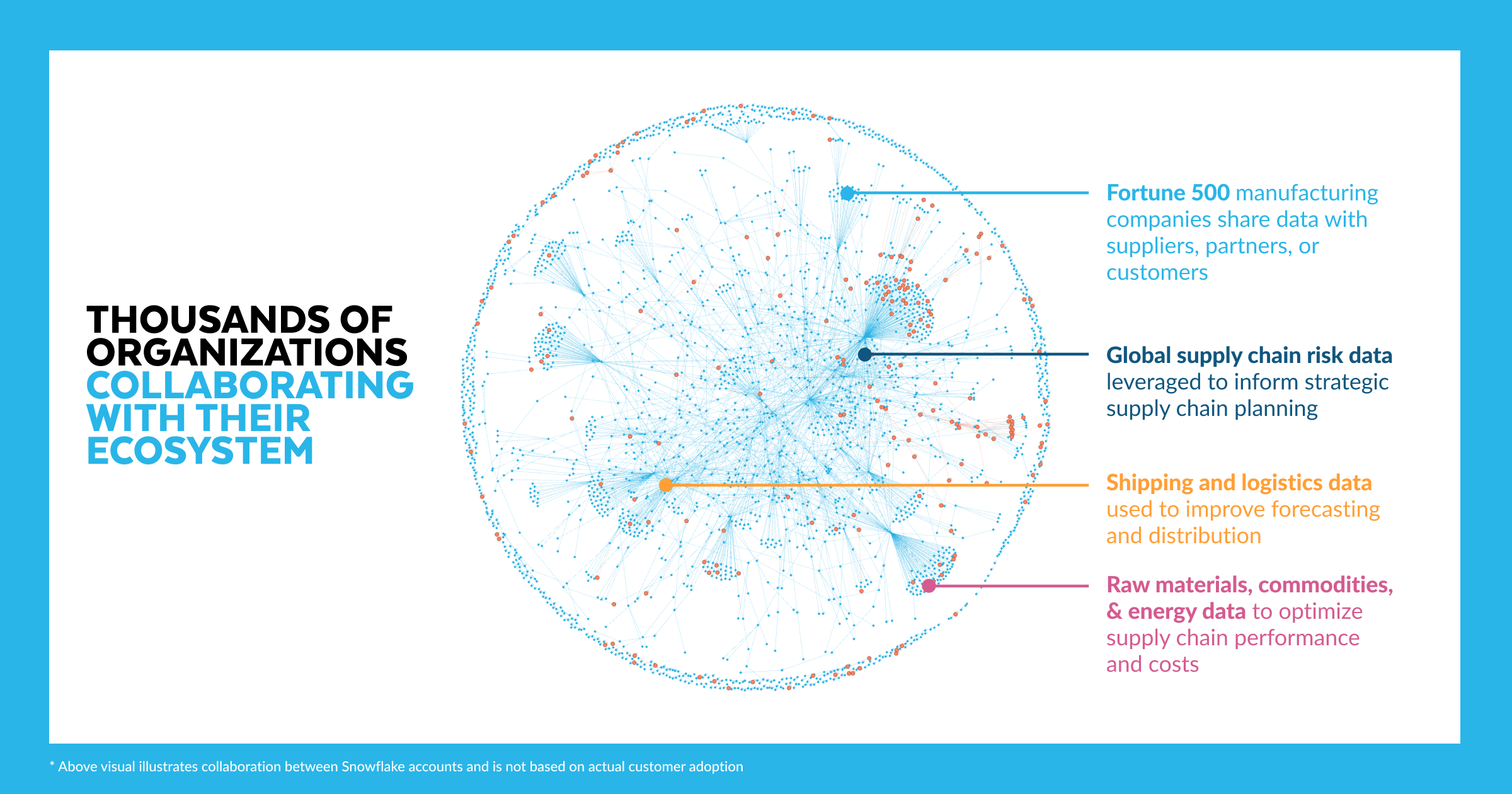 2. Impulsar el rendimiento de la cadena de suministro: según una encuesta reciente de McKinsey a responsables de la cadena de suministro, el 45 % de los encuestados afirma no tener visibilidad en la cadena de suministro ascendente, y muchos de ellos solo tienen acceso a los proveedores de primer nivel. Manufacturing Data Cloud proporciona visibilidad casi en tiempo real de las operaciones y el rendimiento de la cadena de suministro completa, así como datos para identificar posibles cuellos de botella y riesgos, e información para optimizar el inventario y la logística. Con las funciones Data Marketplace y Collaboration de Snowflake, las empresas pueden obtener mucha más visibilidad de su cadena de suministro.