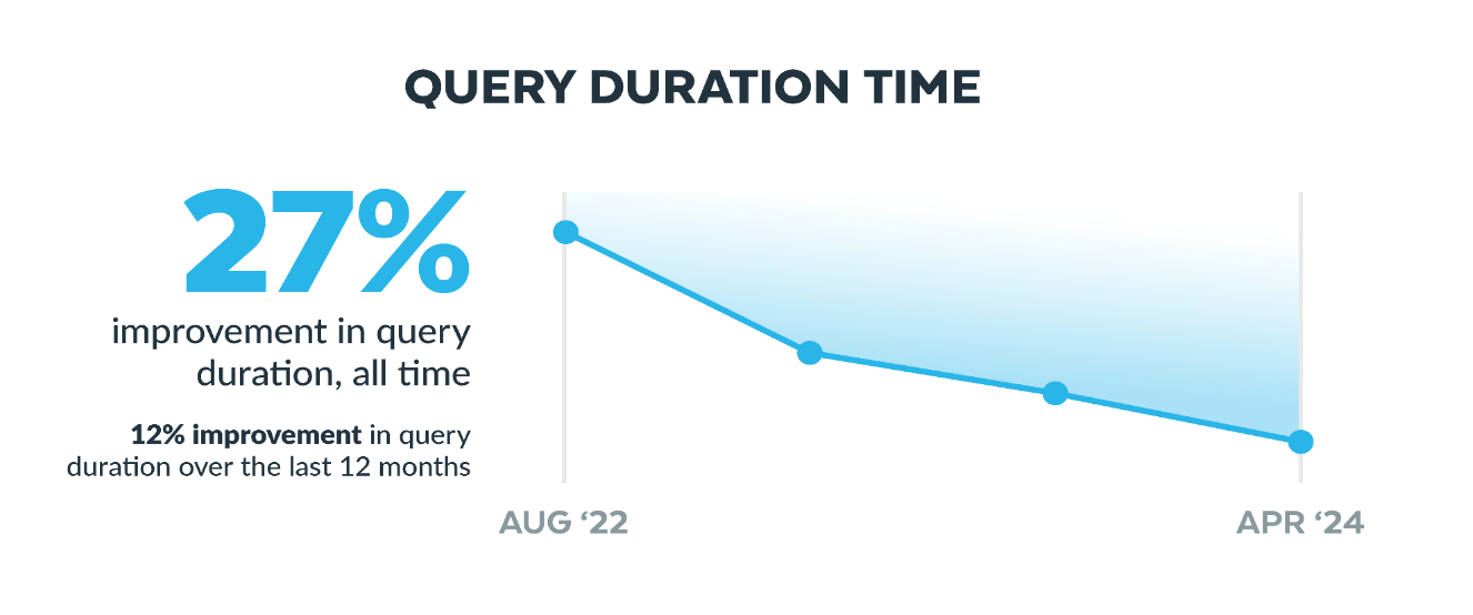 Depuis que nous avons commencé à mesurer le SPI en août 2022, ce dernier a connu une amélioration de 27 %. Au cours des 12 derniers mois, nous avons enregistré une amélioration d’encore 12 %. De plus, le SPI étant calculé sur des workloads clients réels, stables et récurrents, il nous permet de comparer les améliorations de workloads clients spécifiques au fil du temps.