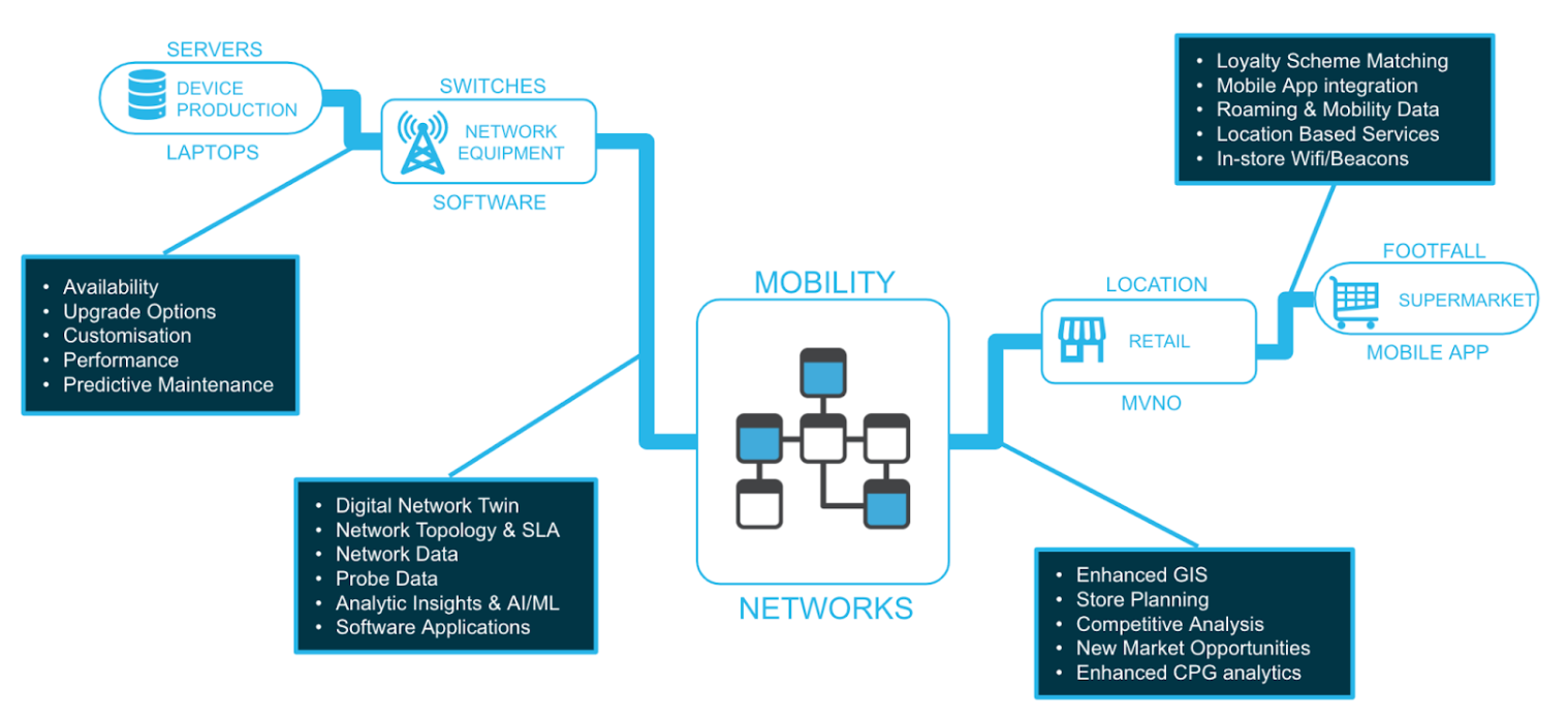 Examinons de plus près l’une des chaînes de valeur. Le réseau de télécommunications de base est approvisionné par différents fournisseurs de réseau, qui dépendent à leur tour des fabricants d’appareils et d’autres fournisseurs de matériel. Les fournisseurs d’infrastructure peuvent partager les informations de télémétrie du réseau avec les fournisseurs de télécommunications, lesquels peuvent utiliser ces informations afin d’enrichir leurs fonctionnalités, telles que le jumelage numérique, et de concevoir différents types d’applications d’IA et de ML. La partie droite du schéma ci-dessous illustre la façon dont les données de localisation et de mobilité provenant des télécommunications peuvent être utilisées pour enrichir les données d’autres secteurs client, afin d’améliorer les programmes de fidélité et le ciblage client, et d’offrir différents services basés sur la localisation.