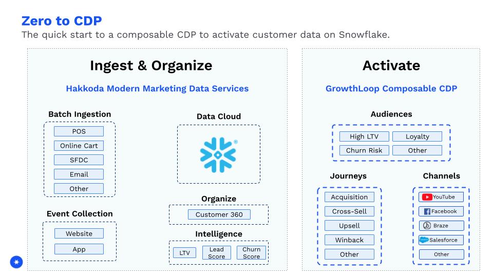 La solution Zero to CDP propose une mise en œuvre de bout en bout, de la création de l’AI Data Cloud Snowflake à la modélisation des données et à l’activation de ces données pour les cas d’usage marketing.