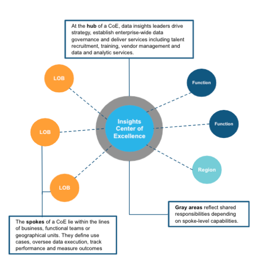 CoEは、単一のサイズですべてに対応できるわけではなく、会社のニーズと現在の成熟度を反映する傾向にあります。CoEは必ずしも固定の組織や構造ではなく、組織づくりの枠組みのようなものと考えことができます。CoEはハブとなる中核チームを持ち、メンバーはCDO直属または直属ではない部下から選ばれ、協調性を確保しています。組織の各事業部門または部課には、ハブへとつながるスポークの役割を果たす人々がいます。責任はハブとスポーク全体で分担し、組織に応じて責任の所在がはっきり断定できないグレーエリアもあります。