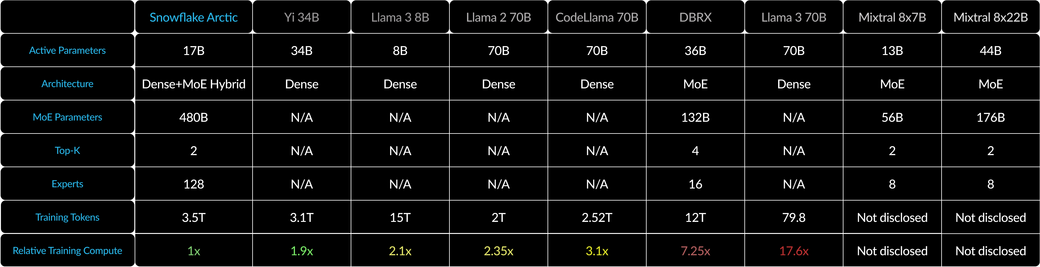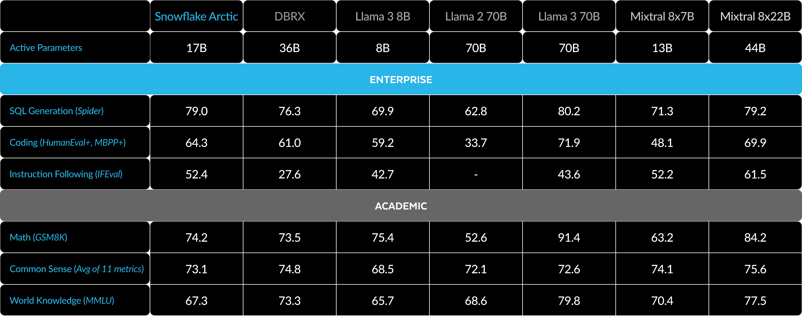 - 効率的なインテリジェント:Arcticは、大幅に高いコンピューティング予算でトレーニングされたオープンソースモデルと比較しても、ベンチマークに従ってSQLの生成、コーディング、命令などのエンタープライズタスクを得意としています。Snowflakeは、Snowflakeのお客様が企業のニーズに合った高品質のカスタムモデルを低コストで作成できるように、コスト効率の高いトレーニングの新たなベースラインを確立しました。