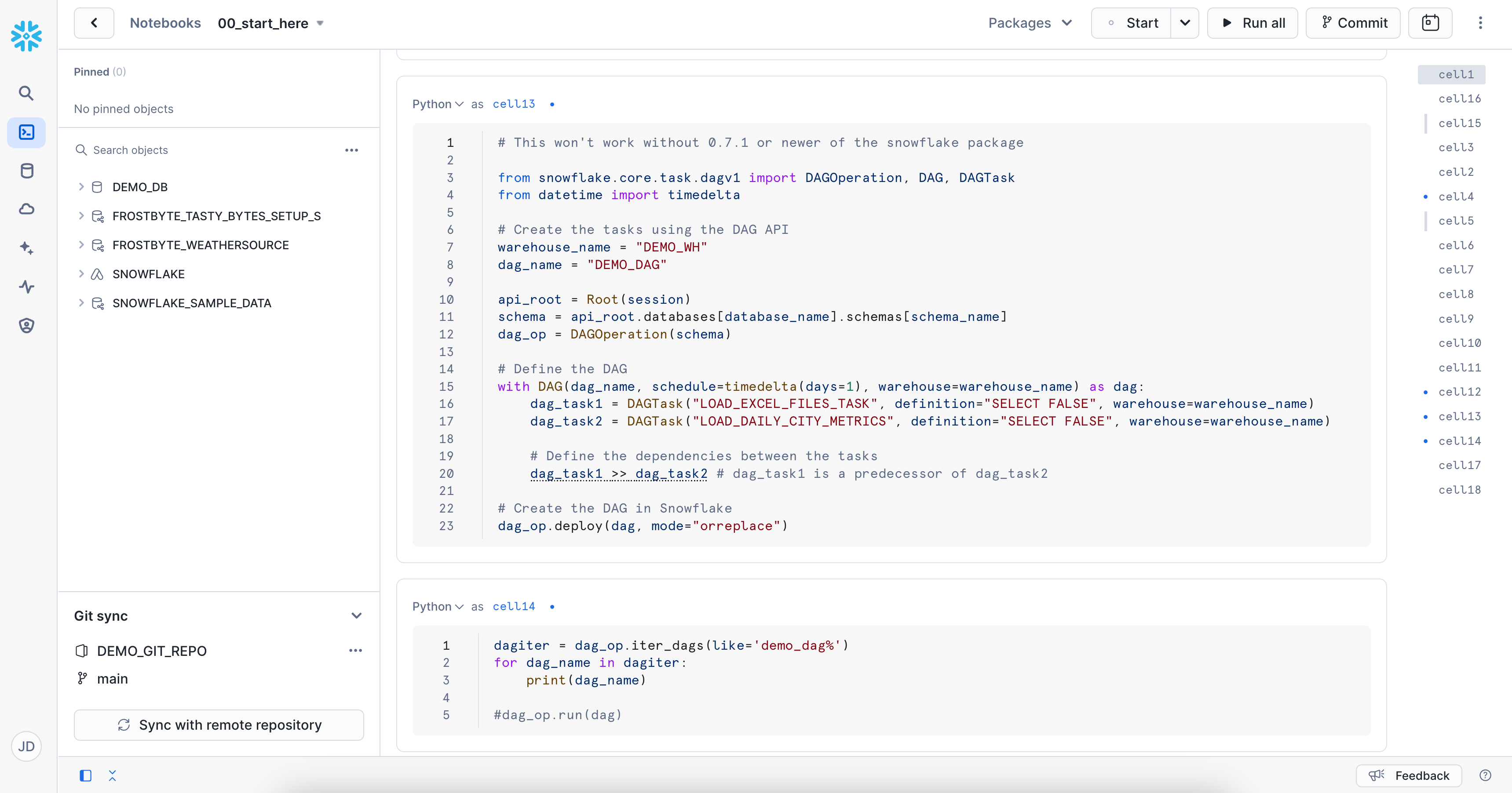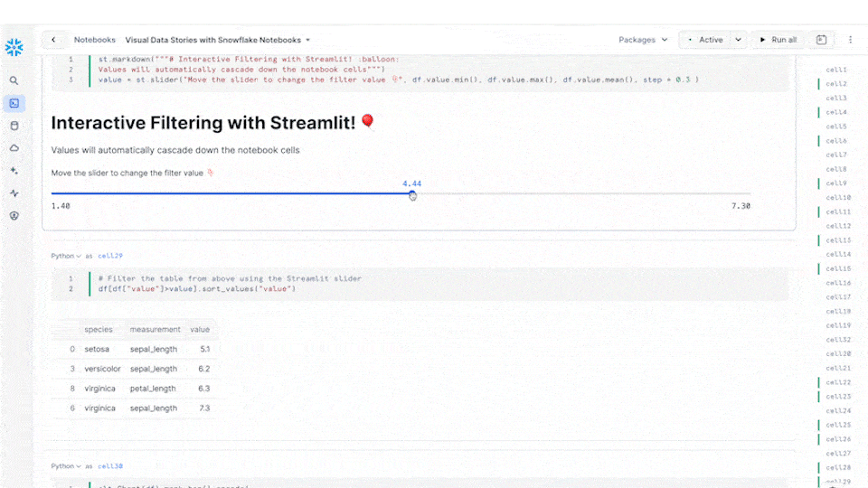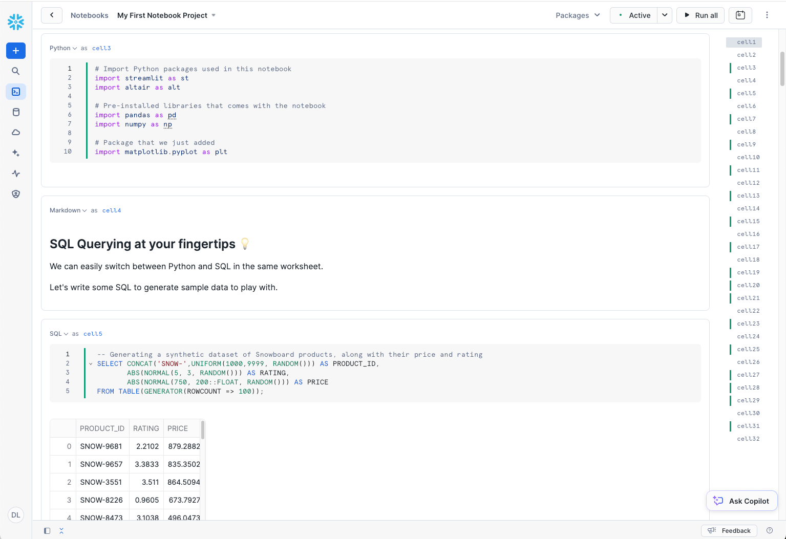 - 統合データ分析:単一の直感的な環境内でデータワークフロー全体を管理できます。ノートブック内でSnowflakeプラットフォームの機能とデータセットに直接アクセスできます。この統合されたアプローチにより、コンテキストの切り替えがなくなり、未加工データをこれまで以上に迅速に実用的なインサイトに変換できるようになります。以下の可能性をご覧ください。