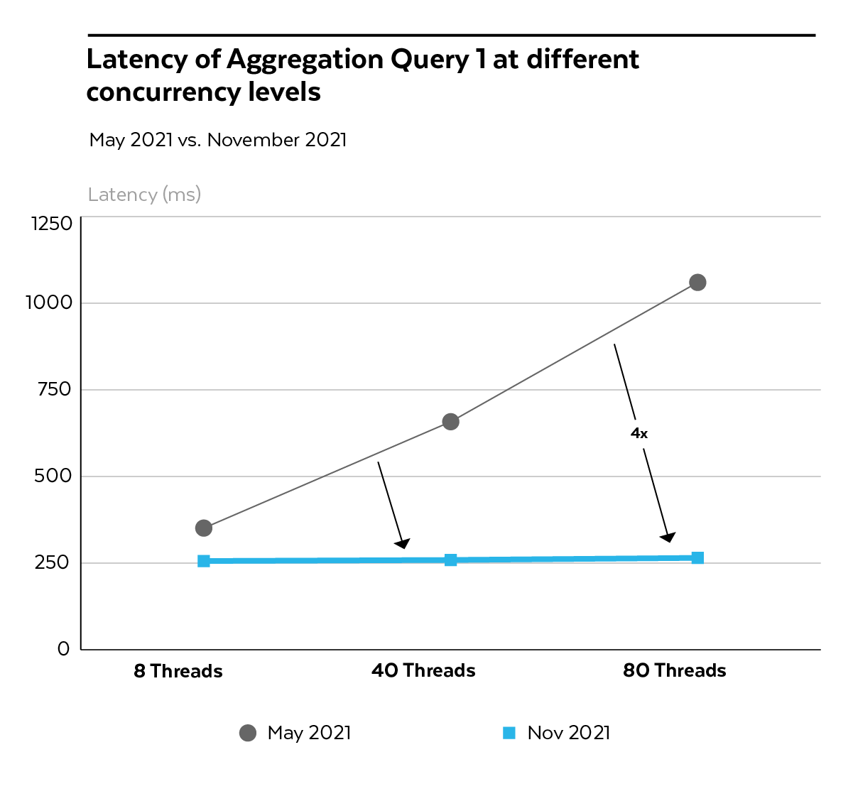 図2:異なる同時実行レベルにおけるアグリゲーションクエリ1のレイテンシー(2021年5月と2021年11月の比較)