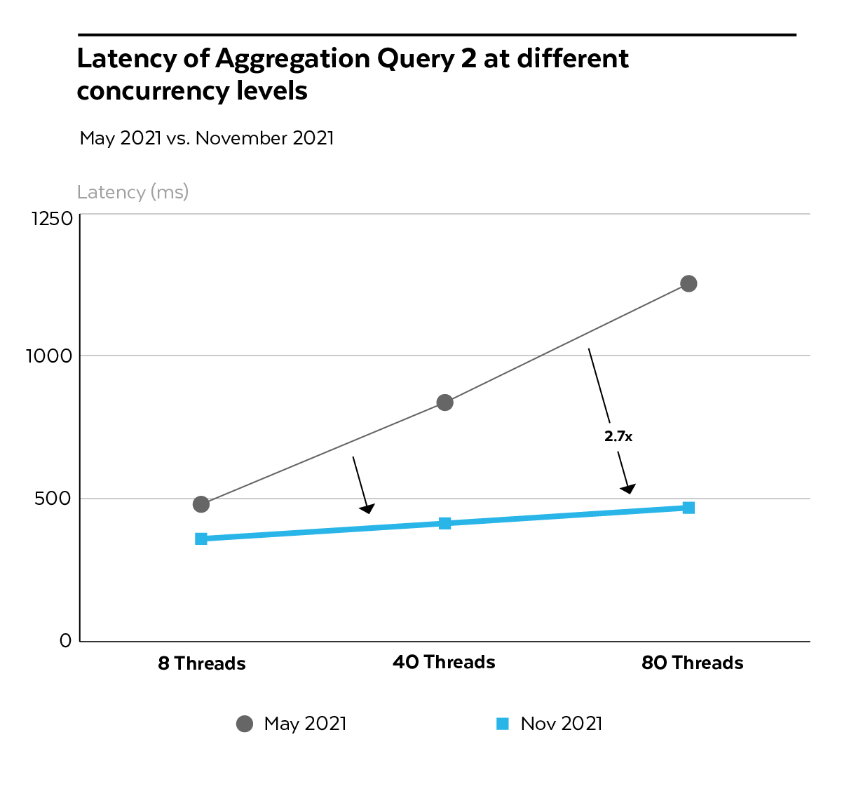 図3:異なる同時実行レベルにおけるアグリゲーションクエリ2のレイテンシー(2021年5月と2021年11月の比較)