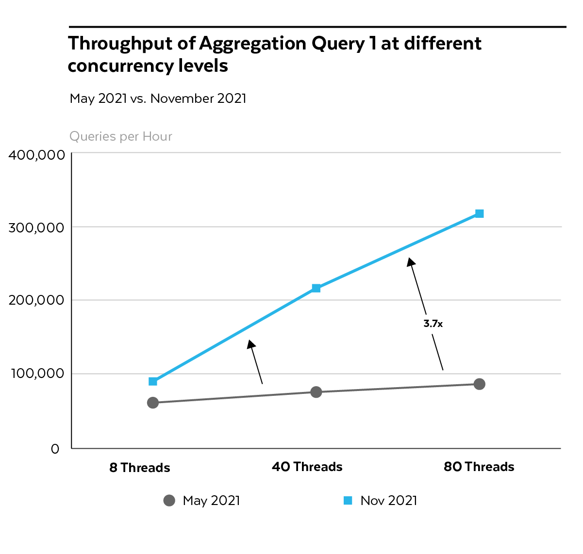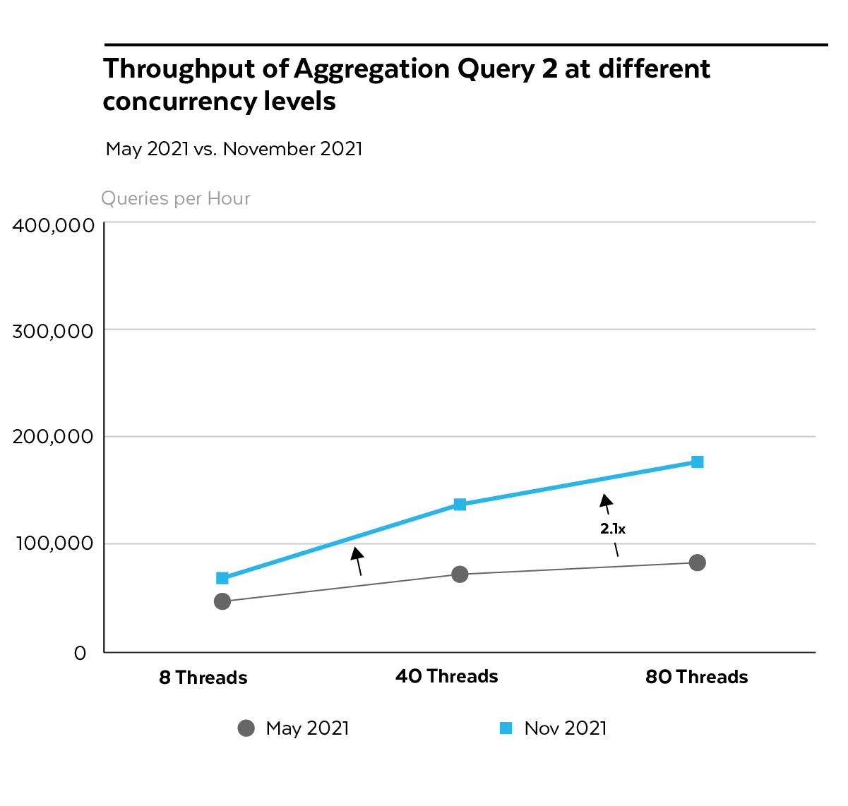 図6:異なる同時実行レベルにおけるアグリゲーションクエリ2のスループット(2021年5月と2021年11月の比較)