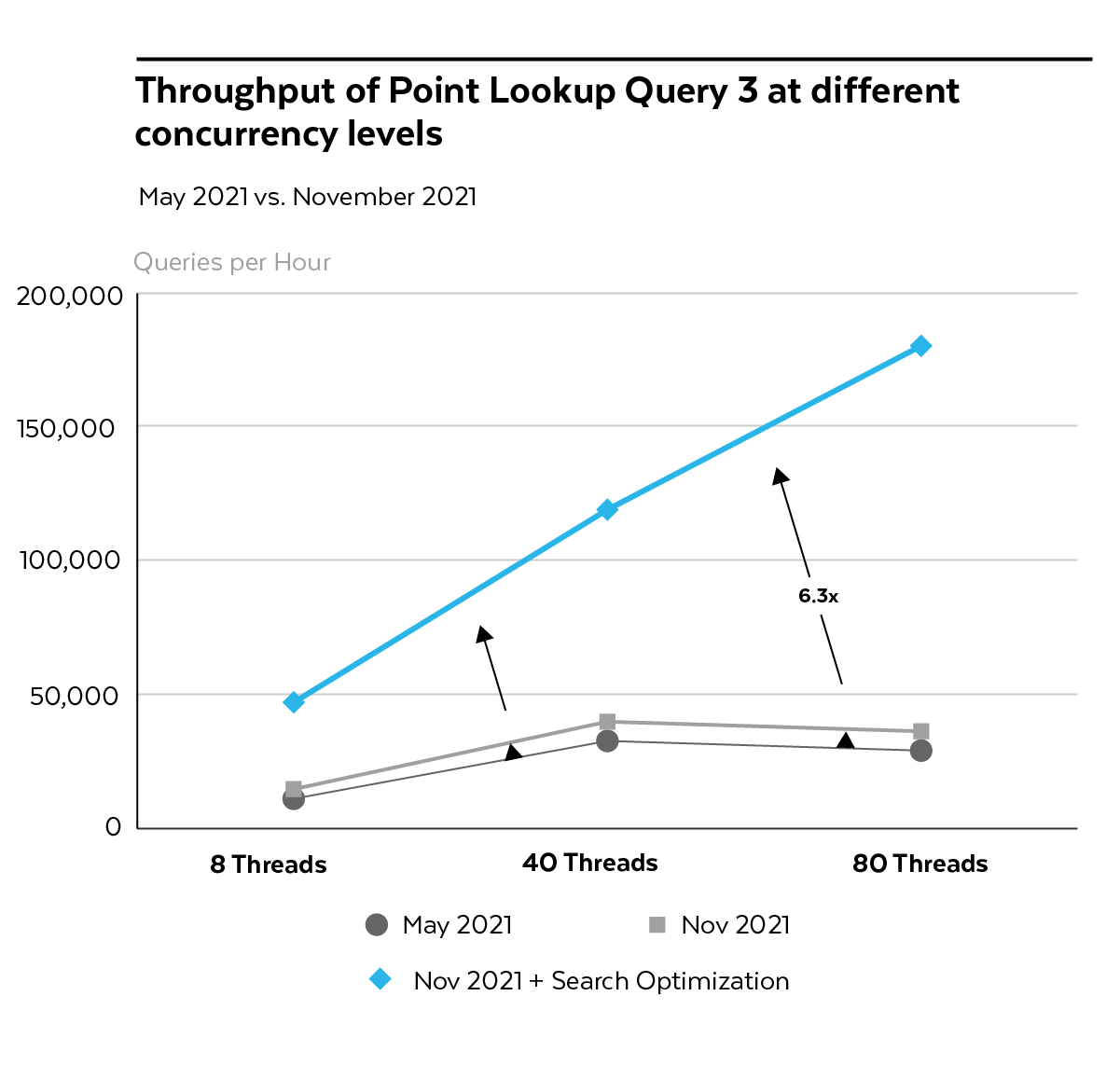 図7:同時実行および検索最適化サービス有効/無効時の、異なる同時実行レベルにおけるポイントルックアップクエリ3のスループット(2021年5月と2021年11月の比較)