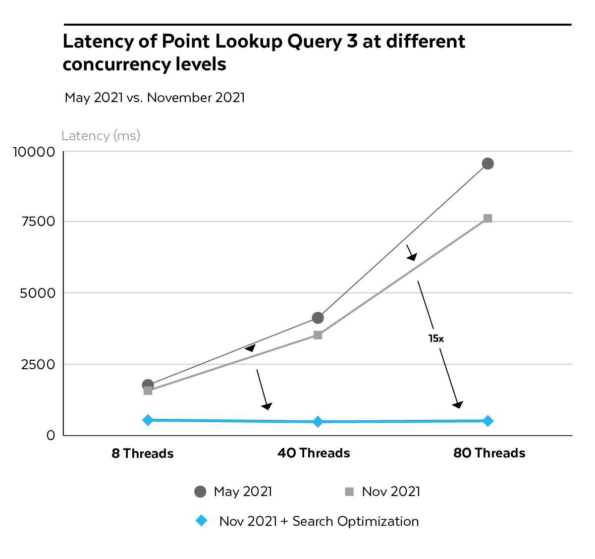 図4:同時実行および検索最適化サービス有効/無効時の、異なる同時実行レベルにおけるポイントルックアップクエリ3のレイテンシー(2021年5月と2021年11月の比較)