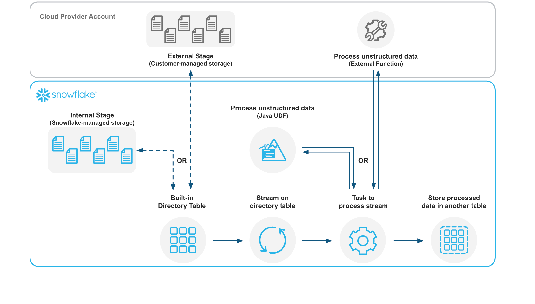 複数のタイプのデータを格納し管理する一元化されたレポジトリを必要とするユーザーの場合、Snowflake内で非構造化データを保存および管理できるだけでなく、エクスターナルファンクションを用いて、あるいはSnowparkおよび現在パブリックプレビュー中のJavaサポートを用いてネイティブ処理することもできます。
