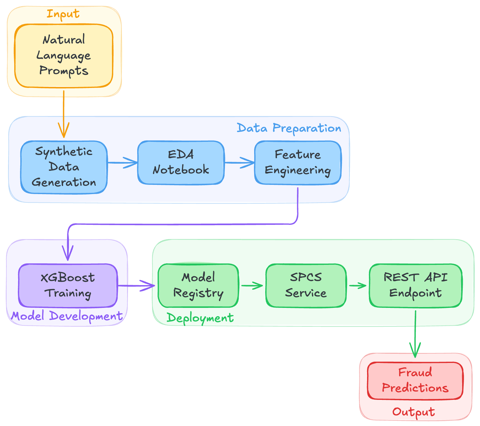 おめでとうございます!Snowflake ML でわずかな自然言語プロンプトだけを使って、完全なリアルタイム不正検知モデルの構築に成功しました。