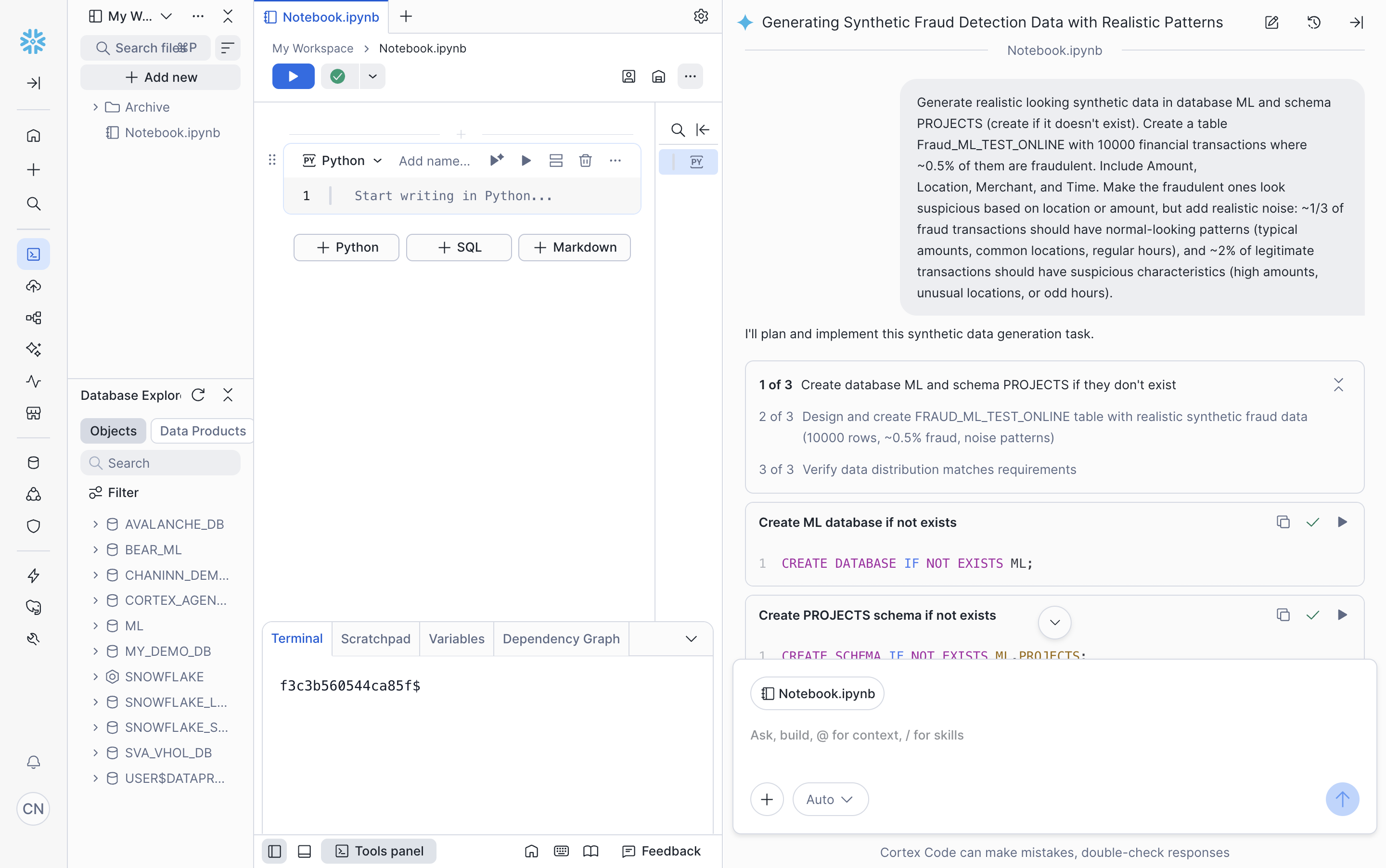 × BASH cortex artifact create notebook fraud_eda ... --location ML.PROJ... └─ {"error":"Error creating artifact: Upload failed: SQL compilation error:\nSch... * The notebook needs a workspace. Let me check what's available and create one if needed. ✓ SNOWFLAKE_SQL_EXECUTE List existing workspaces SQL Result (1 rows × 7 cols) │ 1 │ DEFAULT$ │ USER$DATAPROFESSOR │ PUBLIC │ * There's a default workspace. Let me upload to it. ✓ BASH cortex artifact create notebook fraud_eda ... --connection trial... └─ "success": true
