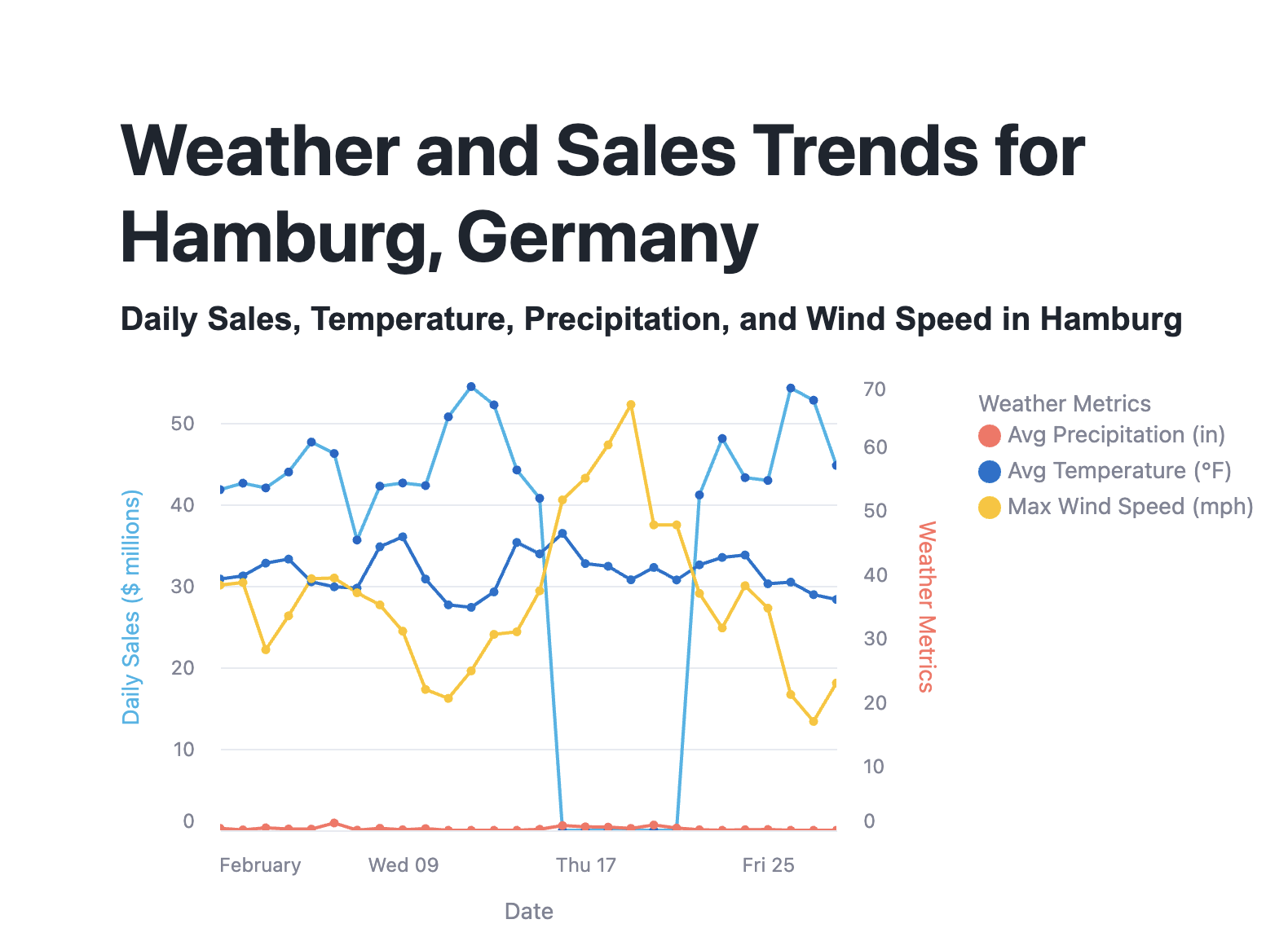 必要なインサイトが揃い、データアナリストに配信する準備が整いました。具体的には、ドイツ・ハンブルクの天候と売上を追跡するビューが用意されています。では、これらのインサイトをデータアナリストがどのように簡単にアクセスできるようにするのでしょうか?