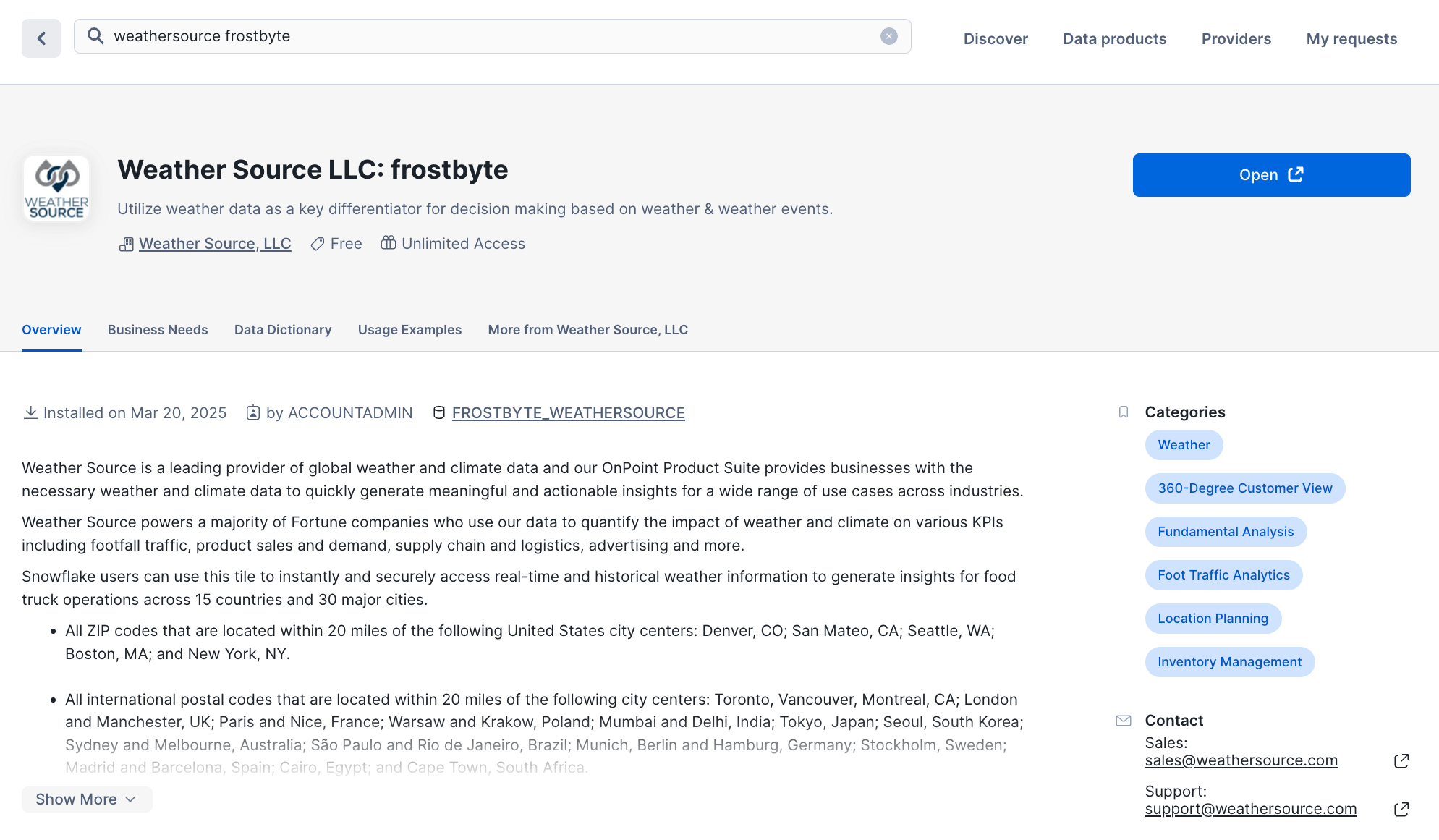 最初の検索結果は、「Weather Source, LLC」プロバイダーによる「Weather Source LLC: frostbyte」であるはずです。そのリスティングをクリックします。