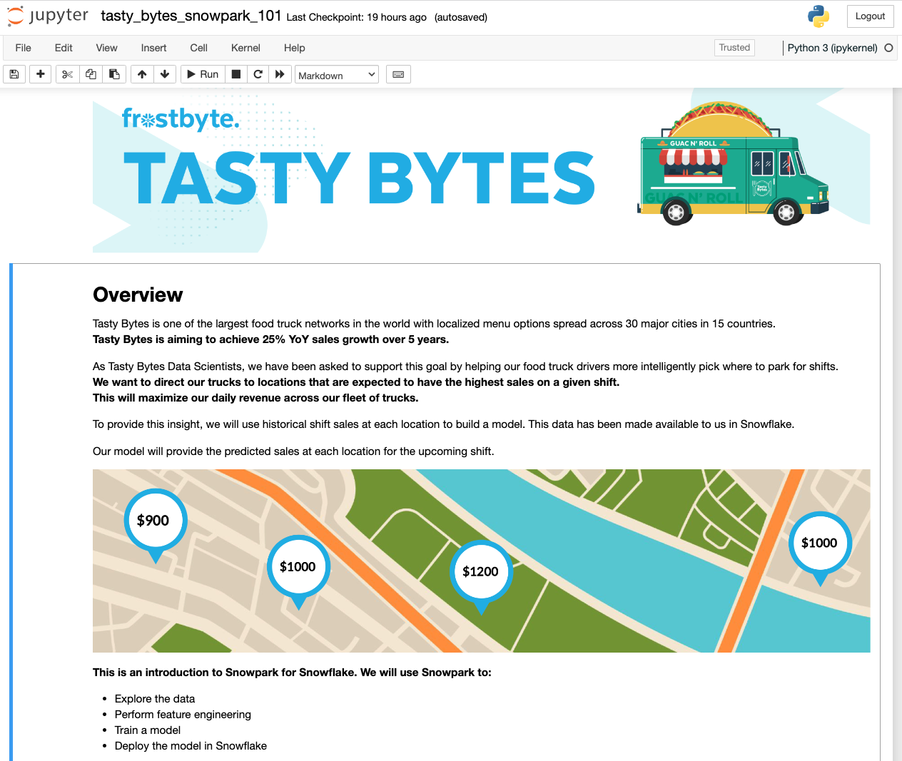 このデータサイエンスのためのSnowpark入門クイックスタートガイドでは、架空のキッチンカー会社であるTasty Bytes社に対し、キッチンカーの運転手にロケーション推奨を提供するモデルのトレーニングを行うことで売上を伸ばす支援をします。Snowpark for Pythonを使用してデータの準備、モデルのトレーニング、モデルの展開を行います。展開後は、Streamlitを使用してアプリケーションのプロトタイプを作成し、キッチンカーの運転手が次のシフトのために駐車する最適なロケーションを見つけるためにこのモデルをどのように利用できるかについてデモを行います。
