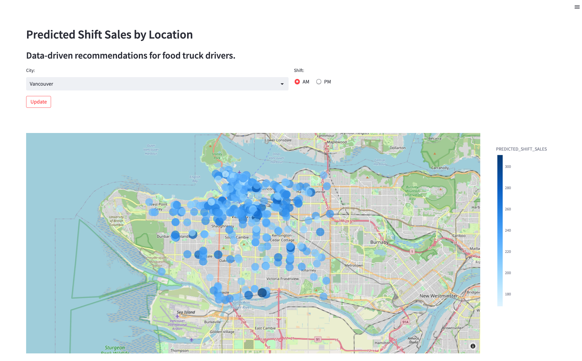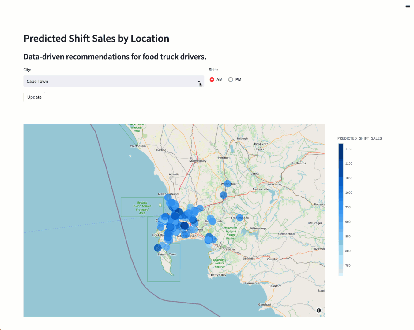 今後のシフトの各ロケーションのシフト売上を予測するモデルを展開しました。次に、キッチンカーの運転手がこの予測を使用して駐車場所を選ぶ方法を見つけます。キッチンカーの運転手がシフト売上予測モデルをどのように操作するかをエンジニアリングチームに示すために、アプリケーションのプロトタイプを作成する必要があります。このアプリケーションでは、ユーザーが都市とシフト時間(午前または午後)を選択でき、その選択に応じて地図上にロケーションごとの売上予測が表示されます。
