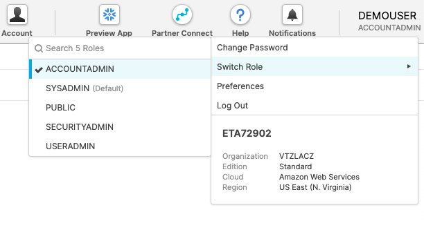기본값인 SYSADMIN에서 ACCOUNTADMIN으로 계정 역할을 전환합니다. 필수는 아니지만, 이 랩의 스크린샷과 웹 UI가 일치하게 만들어 줍니다.