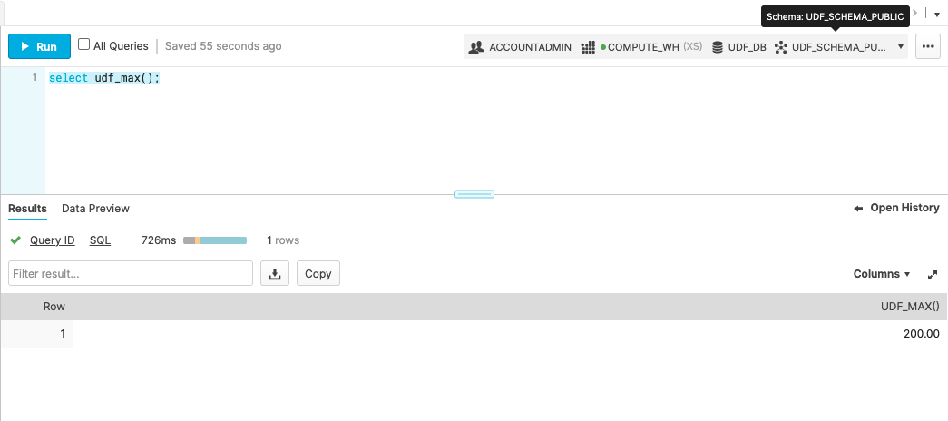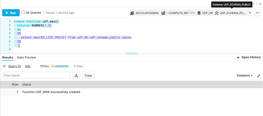 create function udf_max() returns NUMBER(7,2) as $$ select max(SS_LIST_PRICE) from udf_db.udf_schema_public.sales $$ ;