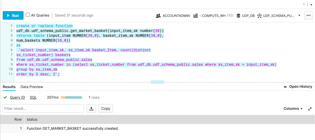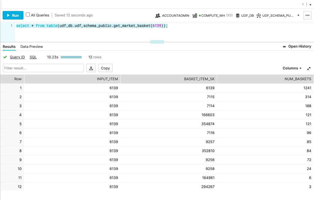 create or replace function udf_db.udf_schema_public.get_market_basket(input_item_sk number(38)) returns table (input_item NUMBER(38,0), basket_item_sk NUMBER(38,0), num_baskets NUMBER(38,0)) as 'select input_item_sk, ss_item_sk basket_Item, count(distinct ss_ticket_number) baskets from udf_db.udf_schema_public.sales where ss_ticket_number in (select ss_ticket_number from udf_db.udf_schema_public.sales where ss_item_sk = input_item_sk) group by ss_item_sk order by 3 desc, 2';