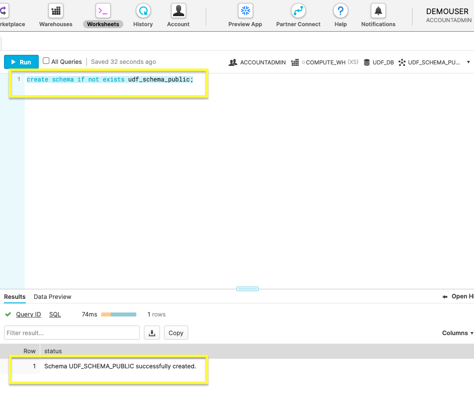 Positive : Results는 Schema UDF_SCHEMA_PUBLIC successfully created라는 상태 메시지를 표시해야 합니다.