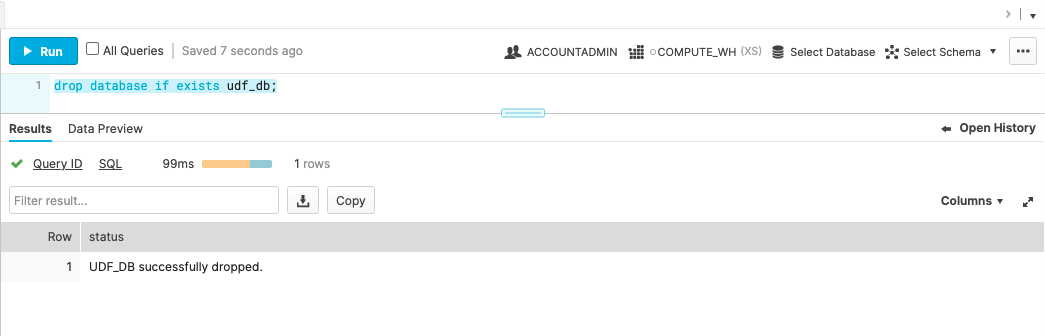 UDF_DB successfully dropped의 Results를 확인하여 데이터베이스가 완전히 삭제되었는지 확인합니다.