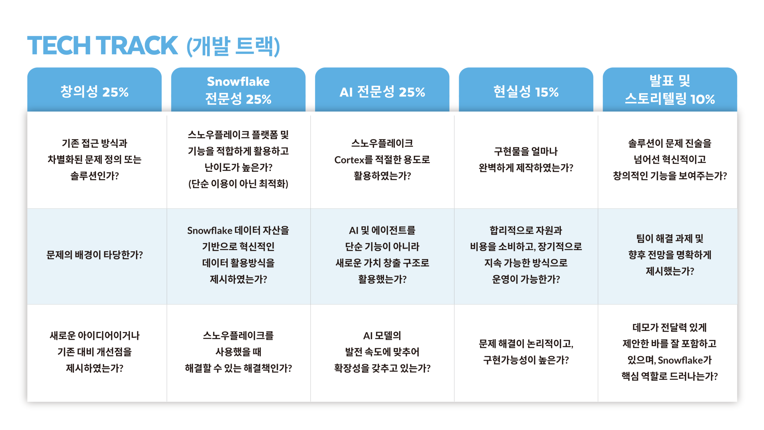 12) 심사위원단은 참가자의 발표, 애플리케이션, 동영상을 각 트랙의 심사 항목을 기준으로 평가합니다.